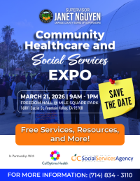 OC Animal Care is proud to host an information booth at the Community Healthcare and Social Services Expo, hosted by First District Supervisor Janet Nguyen, on Saturday, March 21st, at Freedom Hall in Fountain Valley.  The fair will offer dental, vision, and health screenings, CalFresh/Medi-Cal enrollment, and resources from community partners.  While you're there, you'll also meet members of the OC Animal Care team, learn about responsible pet ownership, view our available dog's binder, and receive giveaways.
