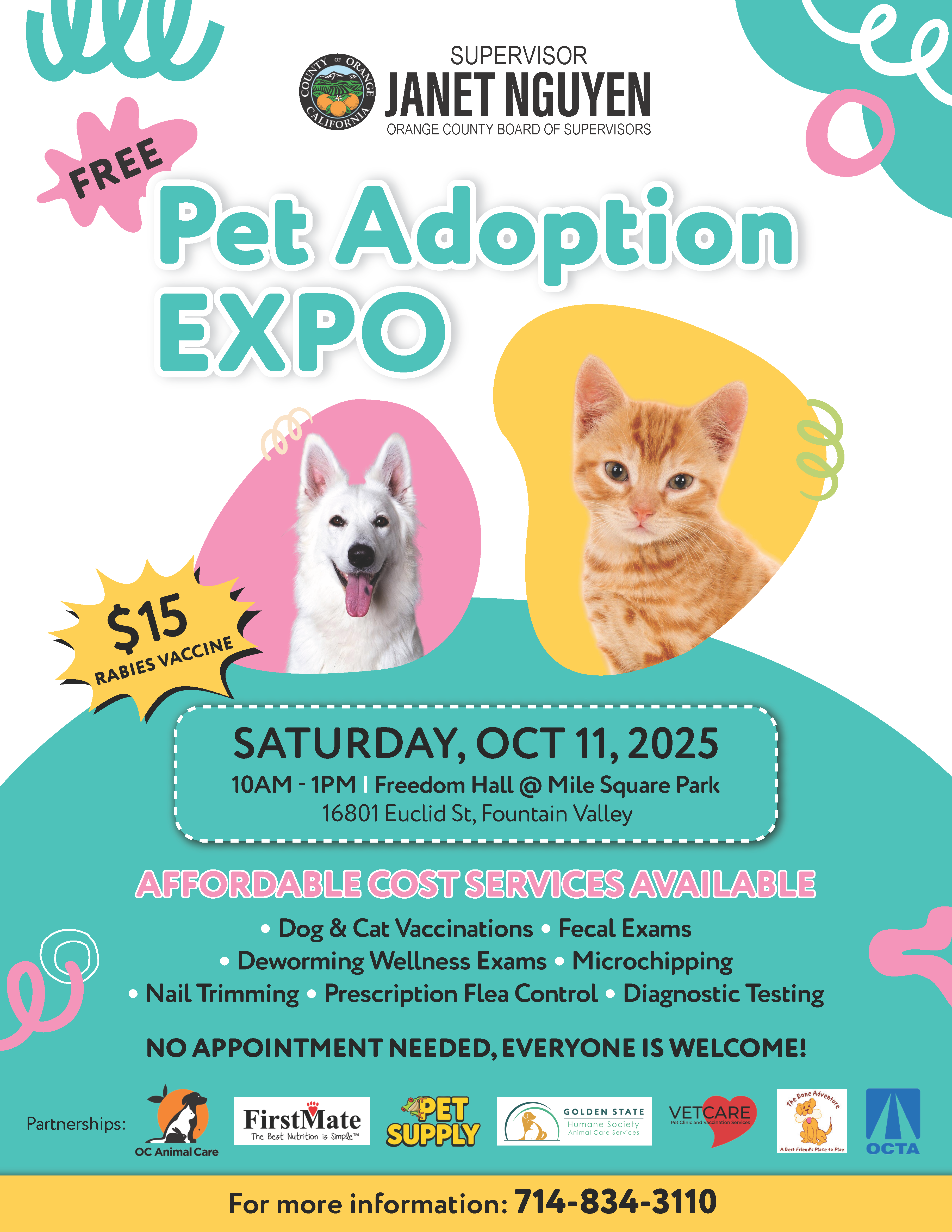 Find your new furry family member and take advantage of low-cost clinic services all in one place!   Join us for First District Supervisor Janet Nguyen's Pet Adoption Expo on Saturday, October 11th.  While you're there, you'll meet members of our OC Animal Care team and our wonderful, adoptable animals.  Whether you’re looking to adopt or care for your current pet, this is the event you don’t want to miss.