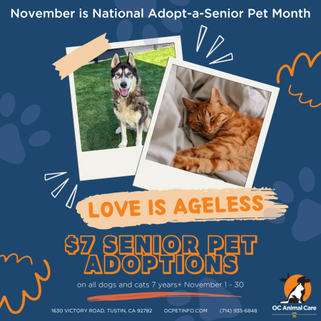 Age is just a number, and our senior pets are here to prove it! November is National Adopt-a-Senior Pet Month and OC Animal Care is dedicated to helping our senior pets get adopted!